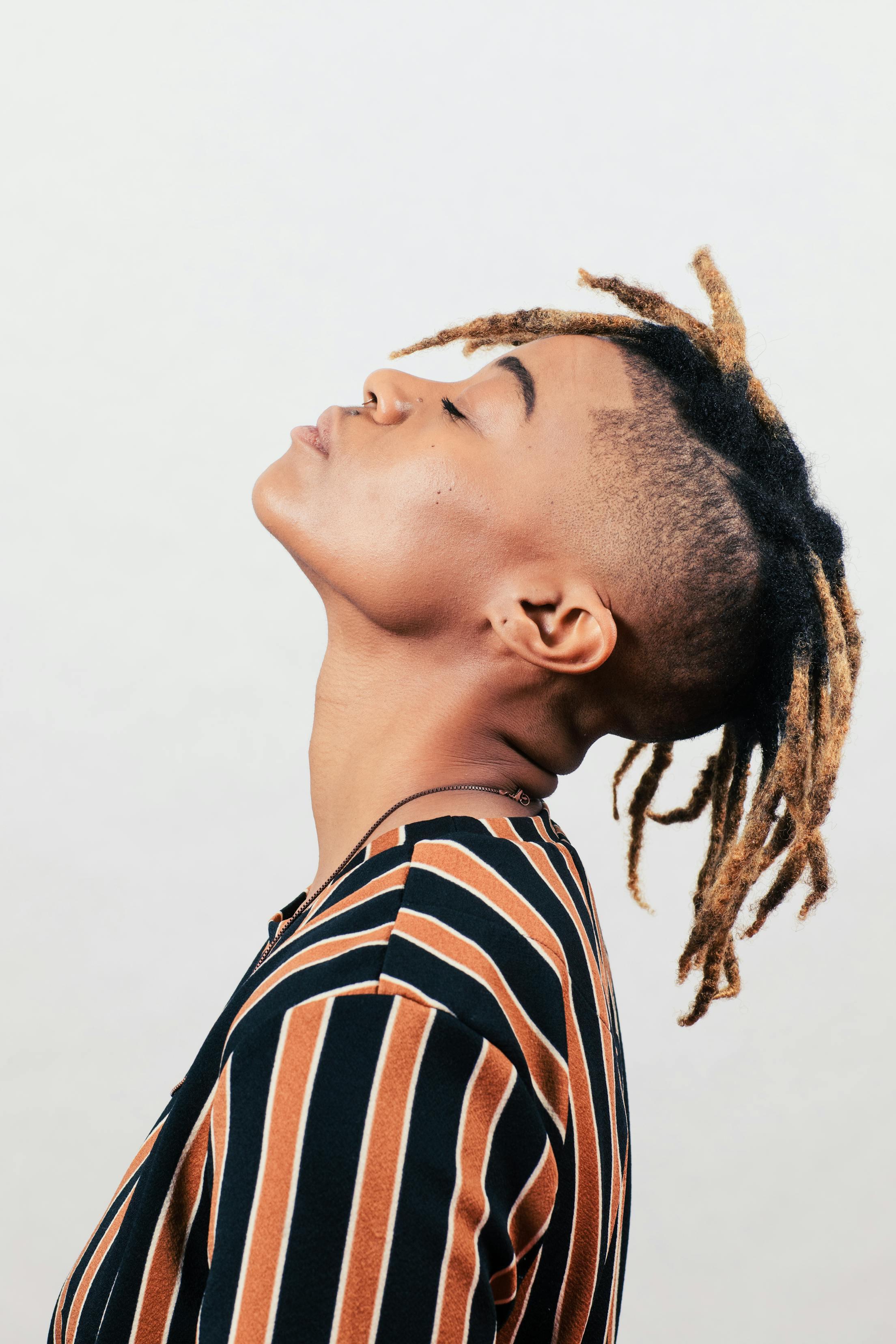 The top section of the hair is styled or cut starting from the widow's peak down to the nape of the neck, creating a dramatic contrast. This bold hairstyle is not just a look; it’s a statement meant to be seen!